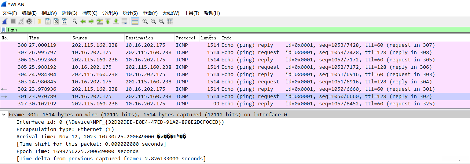 2)在cmd窗口中输入ping www.swust.edu.cn,待ping结束后,停止捕获。