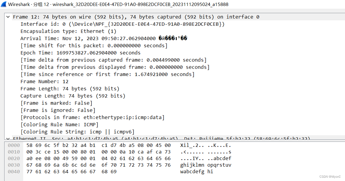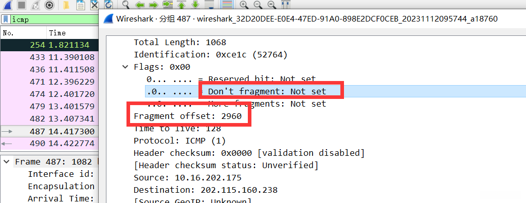 在IPv4头信息中,定位'Flags'字段,未见DF字段设置,意味着数据包可以被分割。若数据包被分割,'Identification'字段将获取相同的标识信息。