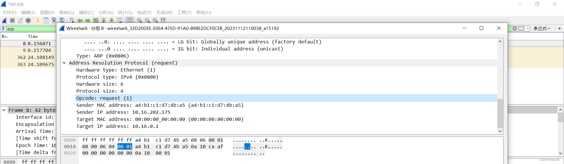 Opcode: request (1),表示这是一个ARP请求(ARP询问)的报文