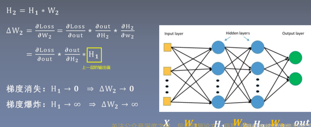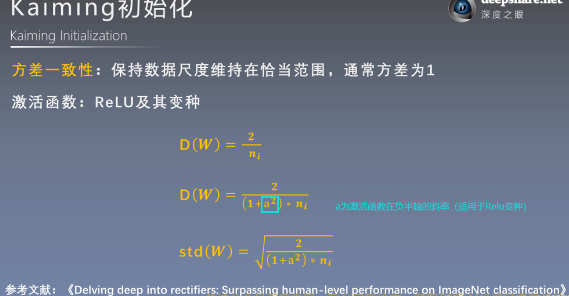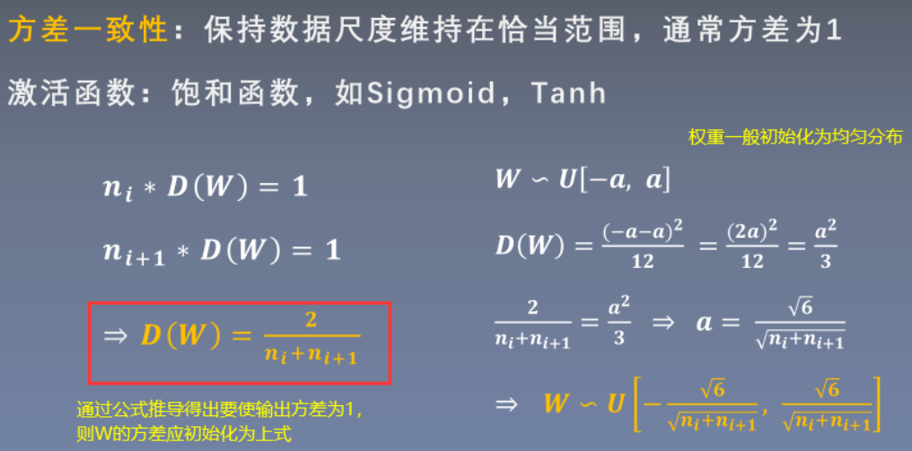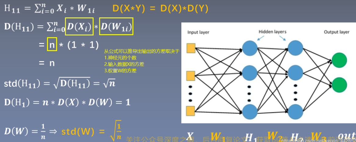 通过观察图中的公式可以看出,在每一层传播过程中,输出数据集的方差会乘以因子n。为了保证输出层H的尺度范围不受限制且稳定在初始输入X的波动范围内,则必须限定输出层的方差保持在1这一水平。基于此原则,在权重初始化时应令其方差为1/n(其中n表示神经元数量),从而实现对传播深度的有效控制