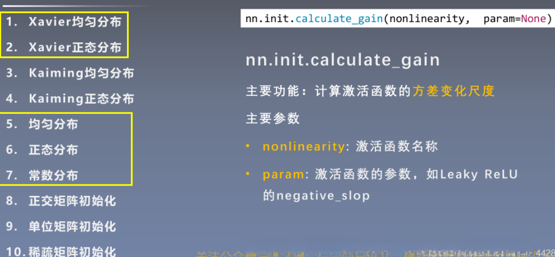 合适的权重初始化有助于提升模型的训练效率和优化效果。相反地,在权重初始化不当的情况下,则可能导致梯度消失或爆炸现象——这将使得网络无法有效完成训练过程。因此有必要对网络输出值的尺度范围进行严格控制。在PyTorch库中,默认提供了多种高效的权重初始化方法——其中最常用的方法包括Xavier系列和Kaiming系列等;此外还有其他如正交矩阵等特殊的初始化方式。