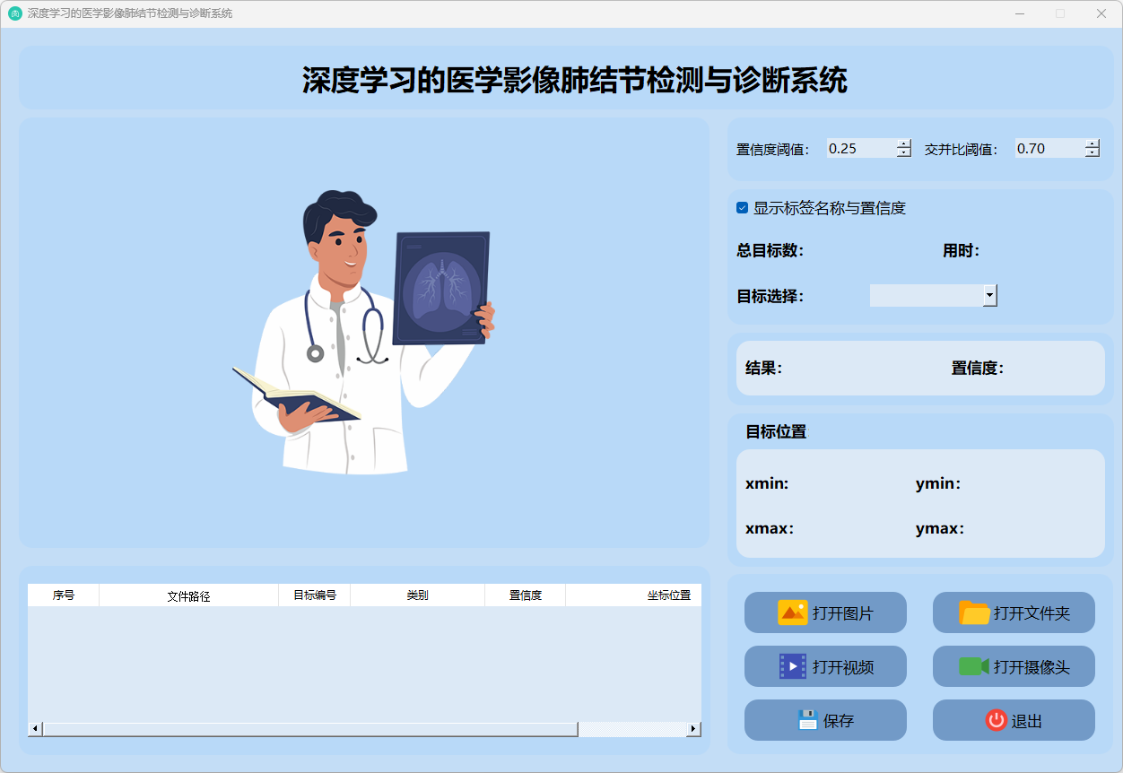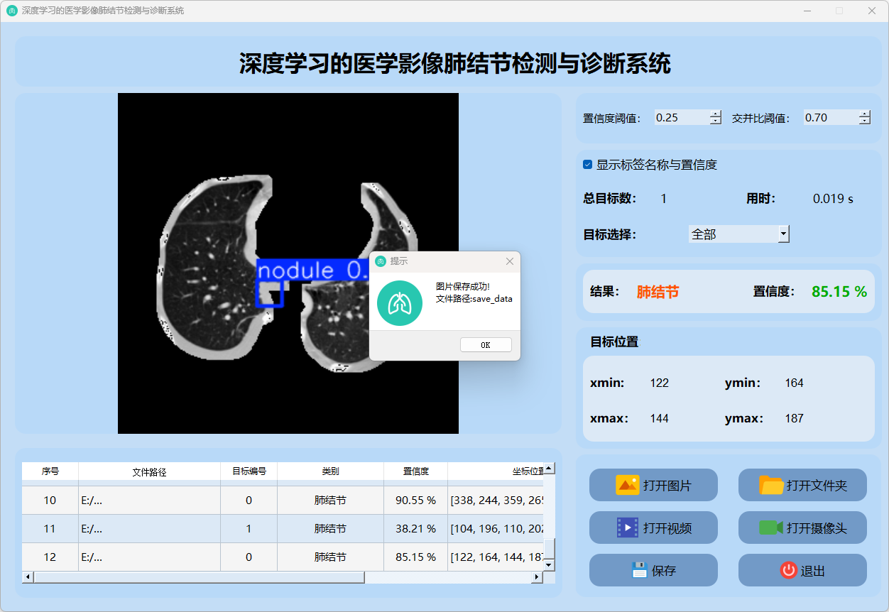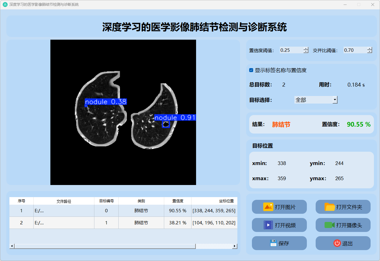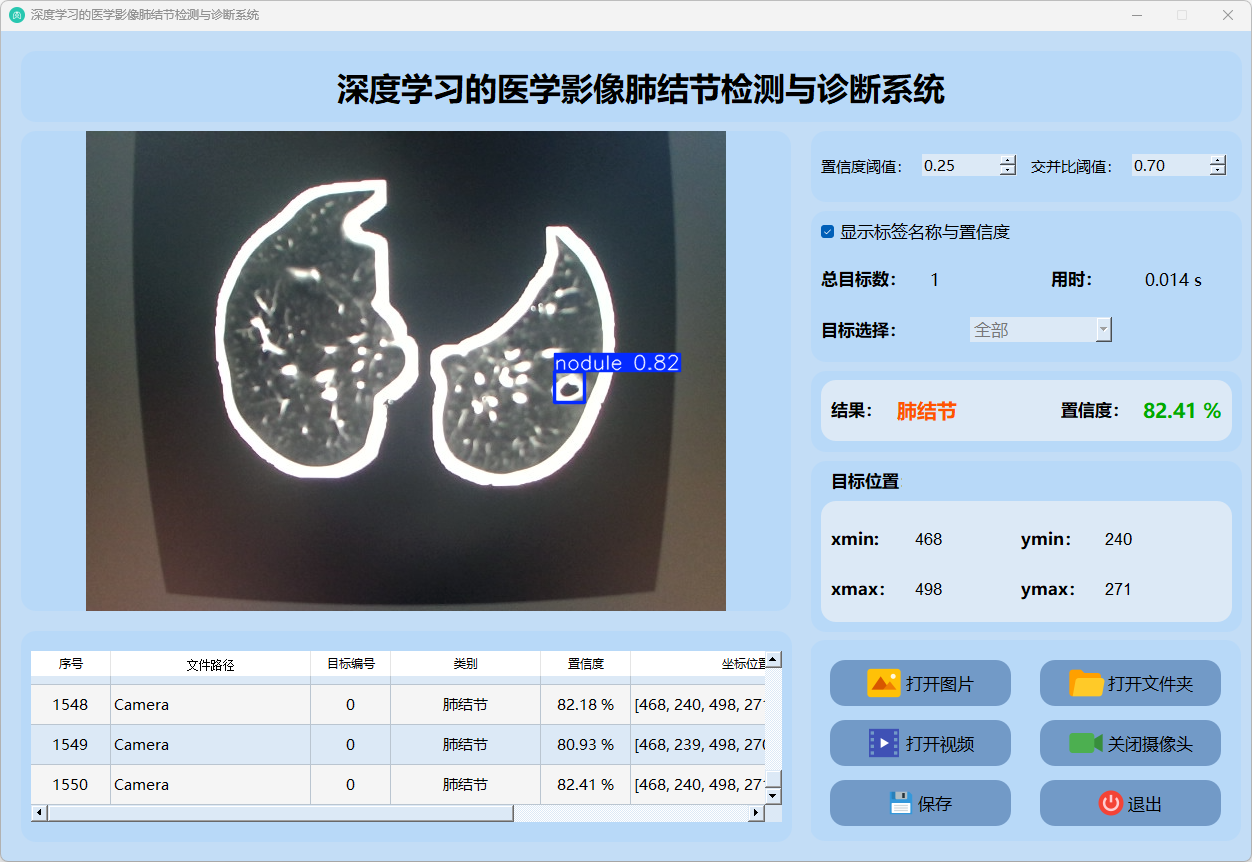 该系统实现了对视频流的实时处理,并能够识别出肺部结节并呈现分析数据。通过表格形式展示了各检测点的置信度评分及其具体位置坐标。