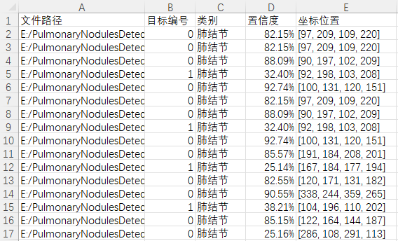 这些坐标表示在图像中的目标区域范围,框定了检测到的“肺结节”的位置。