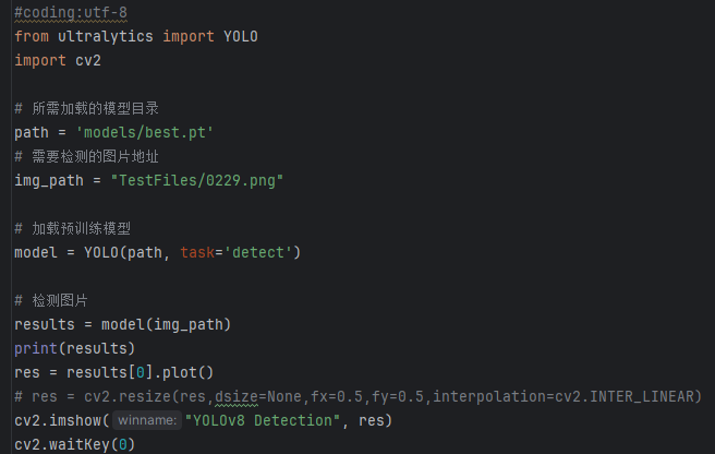 (2)cv2.imshow("YOLOv8 Detection", res):该函数将通过 OpenCV 库展示检测结果,并将窗口标题设置为 "YOLOv8 Detection"。