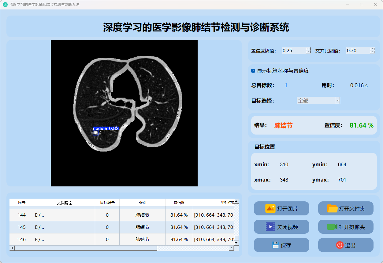 这个界面呈现了系统在视频帧上的多目标检测能力,并具备精准识别肺结节的能力。同时提供了详细的检出结果及相应的置信度评估。