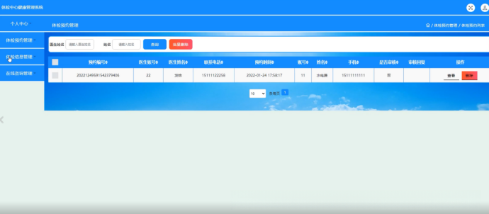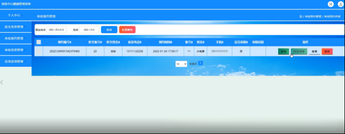 体检预约管理:该页面可让用户查看预约编号及相关信息,并支持相关操作;如图5-19所示。
