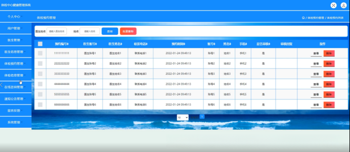 在线体检预约管理系统中, 医生使用该页面浏览包含预约编号, 医生账号信息等各项详细资料的内容进行审查和数据清除操作