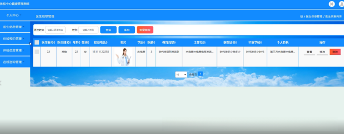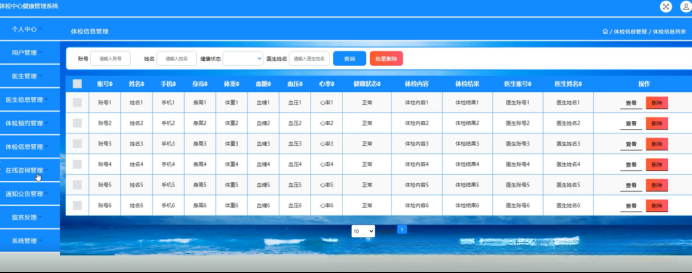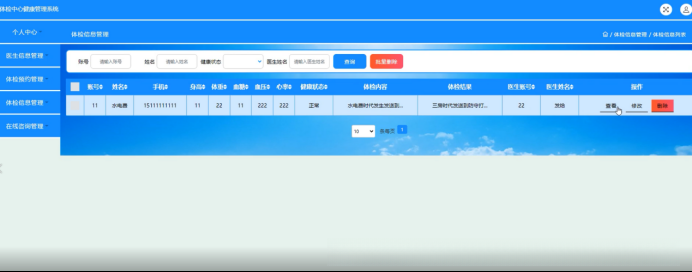 医生可在体检信息管理系统中访问相关数据,在页面内查看账号信息及各项健康参数,并完成各项查看操作