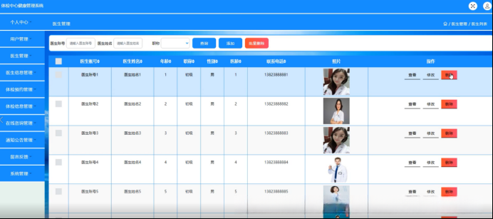 在医生信息管理系统中提供的用户端界面中可以看到包括但不限于以下详细信息:医生账号名及其对应名称、年龄参数以及性别标识符等基础资料;此外还包含联系电话号码等相关联系方式以及个人职业资质认证情况等详细记录;同时系统也提供了相应的个性化展示照片以及教育背景介绍等内容;用户可以根据实际需求实现相关信息的查阅及删除等功能(如图5-12所示)