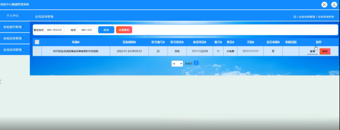 在线咨询管理,在线咨询管理页面允许用户浏览标题、咨询时间段(即预约时段)、医生账号信息以及医生名称,并支持用户根据需求浏览相关记录或删除条目等操作。
