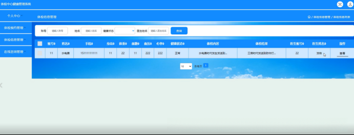 体检信息管理:在体检信息管理模块内进行查询各项数据包括账号姓名手机身高体重血糖血压心率健康状态体检内容体检结果医生账号医生姓名等具体内容如图5-20所示
