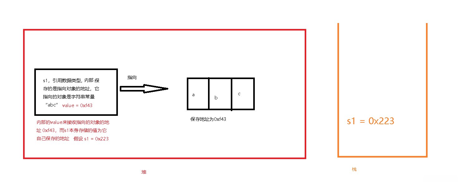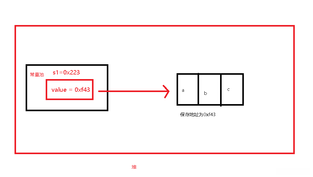 String s1 = “ abc” -------这代表,我创建了一个字符串常量“abc”放在堆中,同时创建了一个String类对象s1,该对象指向的内容是字符串常量“abc”,实际内容为“abc”存放的地址,在s1对象的内部有一个value来接收该地址,而s1的值为s1保存的地址。特别提醒:在栈中进行操作的直接对象是s1的值。也就是说栈中存在s1 = 0x223.