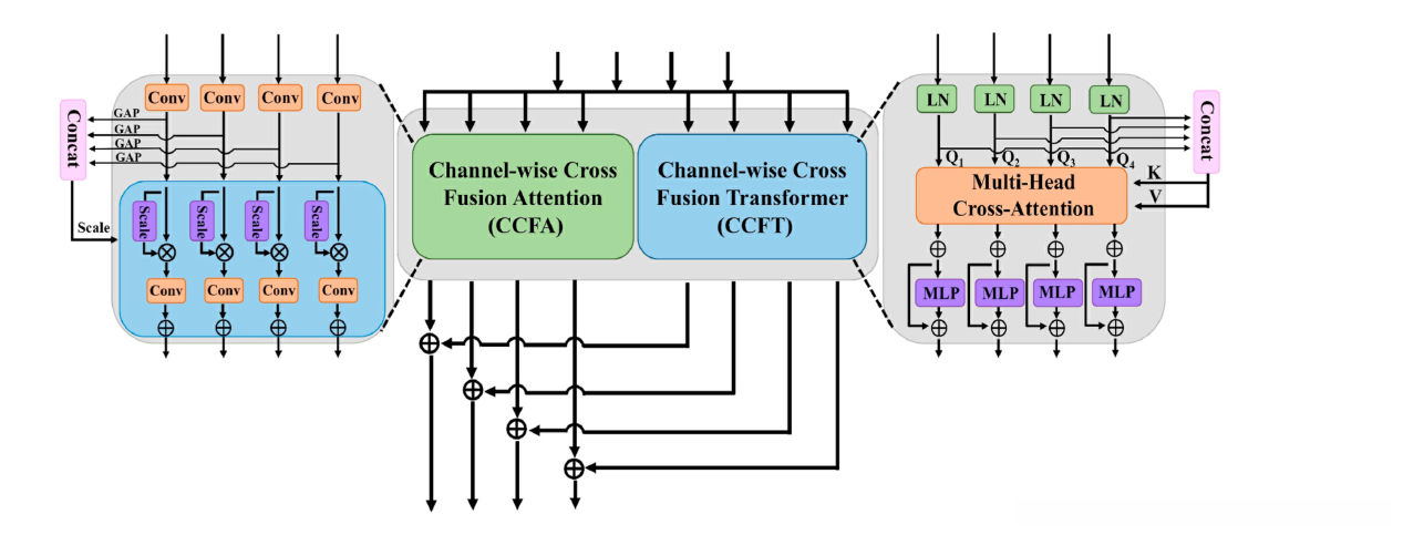 如图所示,CCFT (Channel-wise Cross Fusion Transformer, CCFT)模块是CCFAT模块的组成部分之一,它分三步实现多级特征交叉融合。首先,将编码器不同阶段的扁平特征Xi∈R (H 2i+1× W 2i+1) ×Ci(i= 1,2,3,4)的空间分辨率缩减到相同大小,并通过线性化得到Q, K, V转换。然后,来自四个不同阶段的Ki和Vi分别连接并输入多头通道交叉注意(MHCCA)模块。MHCCA与原来的多头自注意(MHSA)的显著区别在于,自注意操作是沿着通道而不是空间维度进行的。最后,应用MLP块来提供非线性。MLP模块与上面描述的卷积前馈网络保持相同的结构,包括一个层归一化、两个线性变换、一个DWconv和一个GELU激活函数,这与UCTransNet不同。上述过程可表述如下: