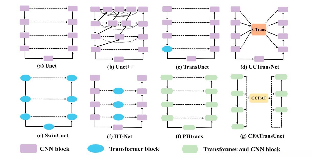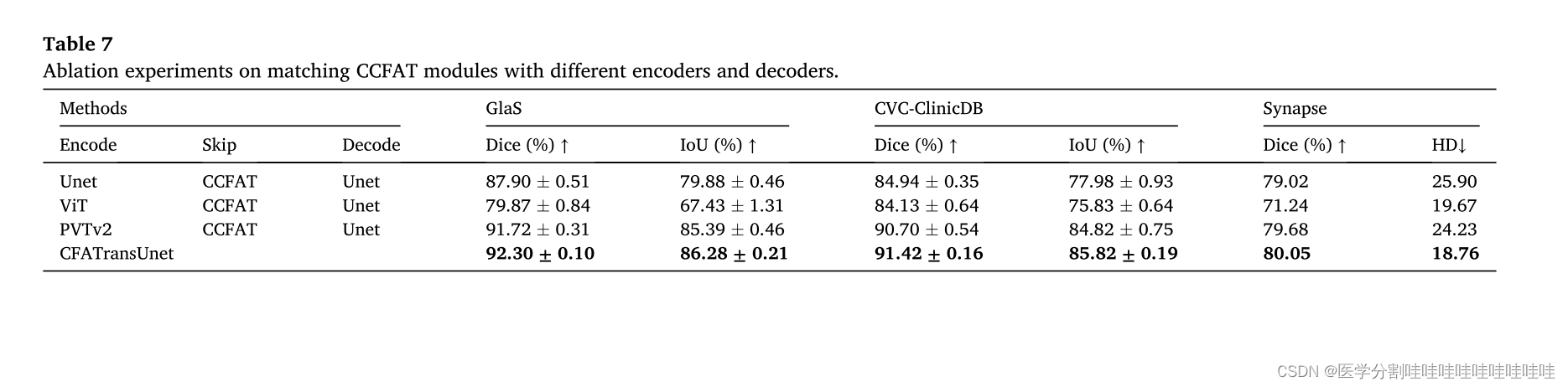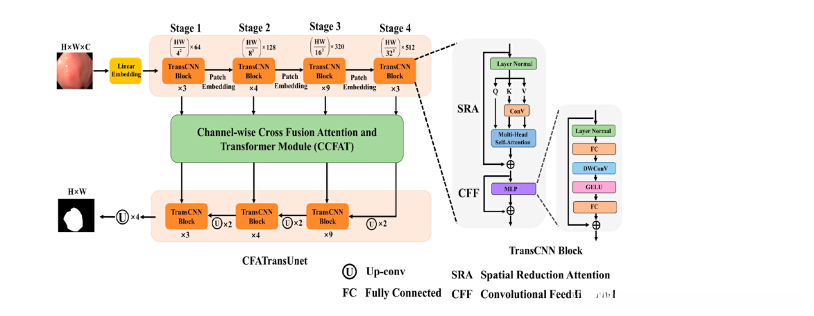 图2显示了提出的CFATransUnet的总体结构,这是一个基于编码和解码的U型网络架构。我们采用PVTv2的基本块[41]作为主干组件,并使用预训练参数。Channel-wise Cross Fusion Attention and Transformer (CCFAT)模块被用作跳过连接的替代方案,以消除多层次特征之间的语义差距。CCFAT模块包含CCFT和CCFA,它们共同引导多尺度特征自适应融合,捕获有效信息,抑制无关噪声。与UCTtansNet相比,本文提出的CFATransUnet有以下差异和改进[25]。(1)使用更强大的特征提取模块(TransCNN块)形成网络结构进行编解码。(2)提出了两种成分(CCFA和CCFT)来消除语义缺口不同的功能。(3)在CCFT前馈网络中,引入DWconV结构,进一步提取局部特征。此外,CFATransUnet只执行一次CCFT,因为我们发现多次执行CCFT不会带来明显的性能提升,反而会增加太多的计算开销。