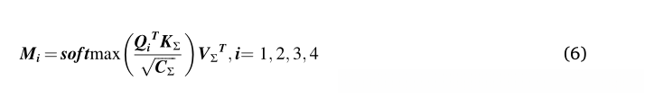 其中嵌入是将不同大小的要素地图的空间分辨率降低到相同的大小,在本研究中,空间分辨率均匀降低7×7。WQ、WK、WV∈RC×C为投影矩阵。QI、KI和Vi分别是从不同的阶段特征获得的查询、关键字和值。K∑、V∑是KI、Vi连接不同阶段的结果。̅̅̅̅̅̅√CΣ表示近似归一化,Mi表示经过MHCCA后的结果。VΣT是VΣ的转置。