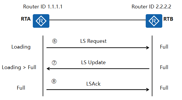 Exchange-Done事件,将邻居状态变为Loading。RTB收到此报文后,会将邻居状态变为Full(假设RTB的LSDB是最新最全的,不需要向RTA请求更新)。 - RTA开始向RTB发送