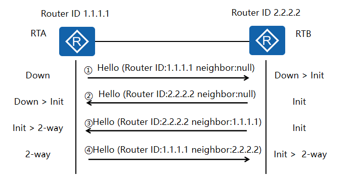 Init。 - RTB 向RTA发送 邻居列表为1.1.1.1的Hello报文 ,RTA 在收到的Hello报文邻居列表中发现自己的Router ID,状态置为
