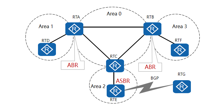 运行在区域之间的路由器叫做区域边界路由器ABR(Area Boundary Router),它包含所有相连区域的LSDB。自治系统边界路由器ASBR(Autonomous System Boundary Router)是指和其他AS中的路由器交换路由信息的路由器,这种路由器会向整个AS通告AS外部路由信息;