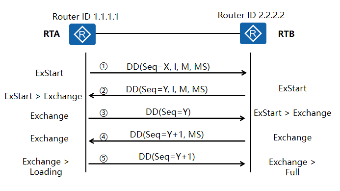 Exchange后,RTA会发送一个新的DD报文,此报文中包含了LSDB的摘要信息 ,序列号设置为RTB在步骤2中使用的序列号Y,I-bit=0,表示这不是第一个DD报文 ,M-bit=0,表示这是最后一个包含LSDB摘要信息的DD报文 ,MS-bit=0,表示RTA宣告自己为Slave 。收到此报文后,RTB会产生一个Negotiation-Done事件,并将邻居状态从ExStart变为Exchange。 - 当RTB的邻居状态变为Exchange后,RTB会发送一个新的DD报文,此报文包含了LSDB的摘要信息,DD序列号设置为Y+1, MS-bit=1,表示RTB宣告自己为Master。