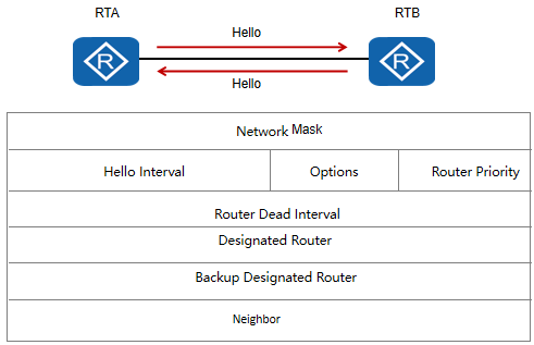 - RTA和RTB的Router ID分别为1.1.1.1和2.2.2.2。当RTA启动OSPF后,RTA 会发送第一个Hello报文。此报文中