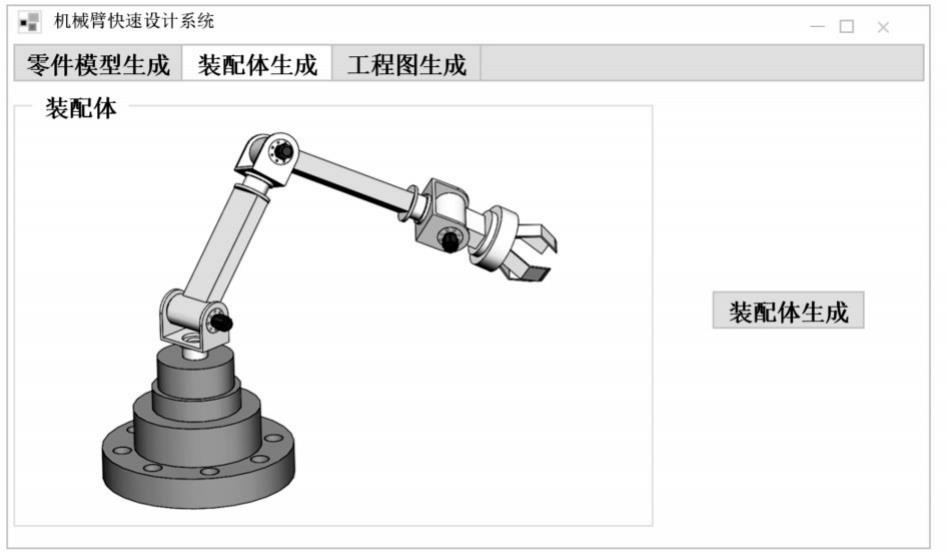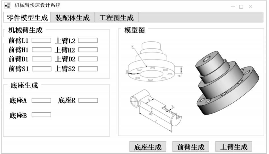 在Visual Studio环境中构建可视化界面,在各个部分(包括零件、装配体和工程图纸)均设有各自的可视化操作界面(如图4至图6)。系统登录后会引导用户进入机械臂关键部件module以获取其详细parameter信息。当user input并 adjust相关parameter后再click 'generate' button即可立即rebuild corresponding mechanical arm components.all mechanical arm components完成后将导入到assembled body module并且此时click 'mechanical arm assembly' generate button即可启动整体mechanical arm assembly process.finally switch to engineering drawing view system will automatically output complete 3D structure drawing