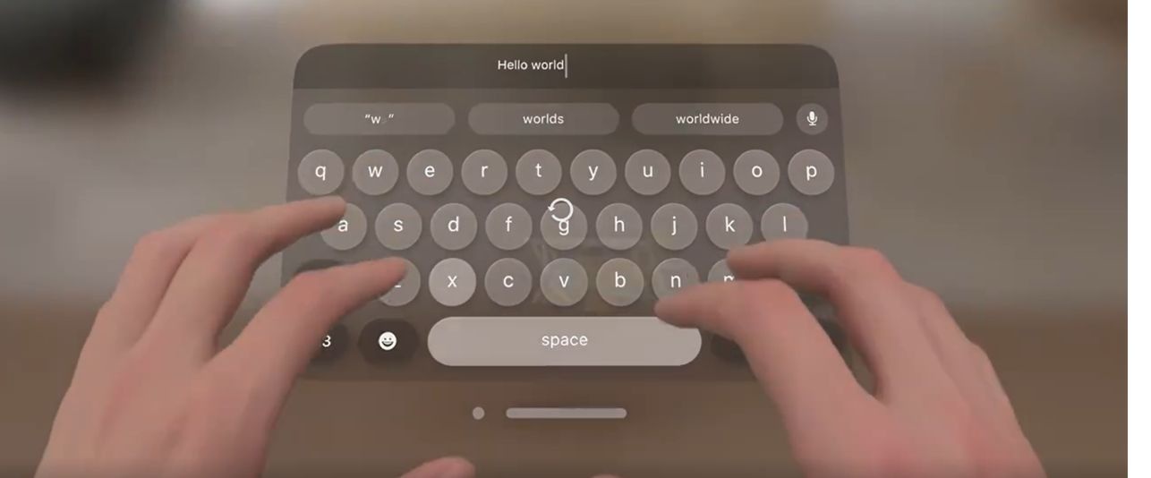 Vision Pro 中输入文字的方式:其中一种采用悬浮于空中的虚拟键盘布局,在这种设计下,用户可以通过手指触控在空中完成文字输入操作。
