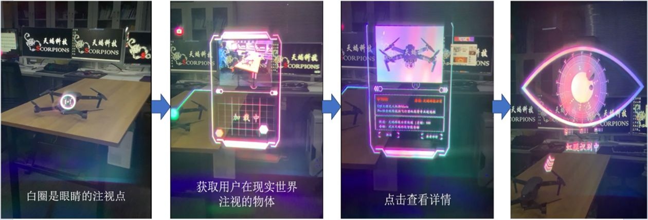 上图展示了本人早年开发的一款基于 [Magic Leap] One 平台的眼动识图购物应用示意图。该系统中以白圈标记用户的关注点,在此场景中用户正凝视一架无人机。该系统实现了对无人机图像信息的 AI 检索功能,并结合虹膜生物识别技术完成了用户的下单购买流程。整个过程模拟了用户通过AR眼镜进行眼动追踪的购物过程。