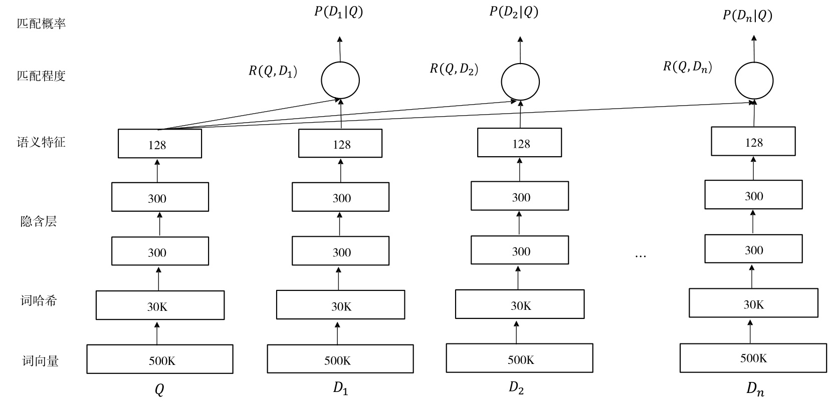 图2所示中_Q_标识查询对象,在_D_标记表示文档的关键字信息,并将_R_与_P_分别定义为相关性计算公式与概率计算公式的表达式。其中第一层构成输入结构,在此层中输入的是高维词向量数据;随后经过词哈希处理后(即执行word hashing处理),该层基于字母的n-gram进行特征提取并降低维度;随后三层均为全连接层,在此过程中通过非线性变换将查询与文档映射至一个公共语义空间;最终在第六层计算给定查询下每个文档的相关度值;网络输出结果为低维语义特征空间中的向量形式;而在第七步则对这些低维向量进行进一步分析以获取最终的结果输出