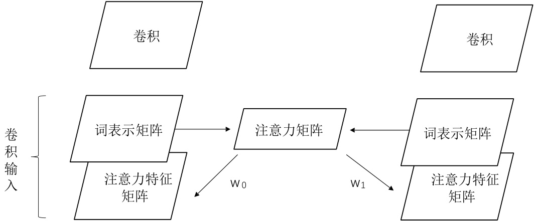 该研究致力于构建一种新的深度学习模型以解决句子匹配问题。其核心创新在于巧妙地将自注意机制与卷积神经网络相结合。这种设计主要应用于三个关键任务领域:语法意义识别、答案选择以及文本隐含信息分析[34]。具体而言该模型包含三种不同的架构设计分别为ABCNN1、ABCNN2和ABCNN3。其中ABCNN1模型在卷积神经网络之前引入自注意机制而ABCNN2则是在卷积操作之后加入自注意模块两者的区别在于前者先关注后再提取局部特征后者则是先提取空间特征后再进行全局关注最终通过混合机制实现了更好的表征学习效果。以ABCNN1为例该模型首先接收输入的待匹配句子每列代表一个词向量这些向量均由word2vec算法[14]提取初始表示。随后构建了一个注意力权重矩阵** A** 这个矩阵通过权重参数w0和w1从初始向量中生成出一组特征表示矩阵每一个完整的句子会被编码为两个这样的特征矩阵随后进入卷积层进一步提取高阶抽象特征从而完成整个匹配过程的关键步骤。