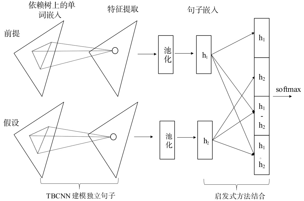 该研究中还探讨了另一种卷积策略用于匹配任务的方法——Hu等[23]提出的方案。该方案构建了两个关键模块:ARC-I和ARC-II系统。其中 ARC-I模块基于Siamese网络架构[24]设计了一个独立生成语义向量的过程;而 ARC-II则在首次卷积操作后实现了两个待匹配文本语义向量的信息融合过程以减少语义信息丢失的可能性。此外 Tree-Based Convolutional Neural Network(TBCNN)模型也首次引入了基于树状结构的卷积神经网络架构来处理语句对建模任务[25]如图4所示 TBCNN的基本框架包含多个层次的设计:第一层是基于树状结构的卷积网络层用于对单个句子进行表征学习;其参数与前一层相同旨在捕获句子的一般语义特征;随后的匹配层则通过启发式机制整合两个待匹配句子的信息;最后输出层采用softmax函数进行分类预测运算目标定义为交叉熵损失函数并采用小批量随机梯度下降算法进行优化以实现模型参数的有效更新