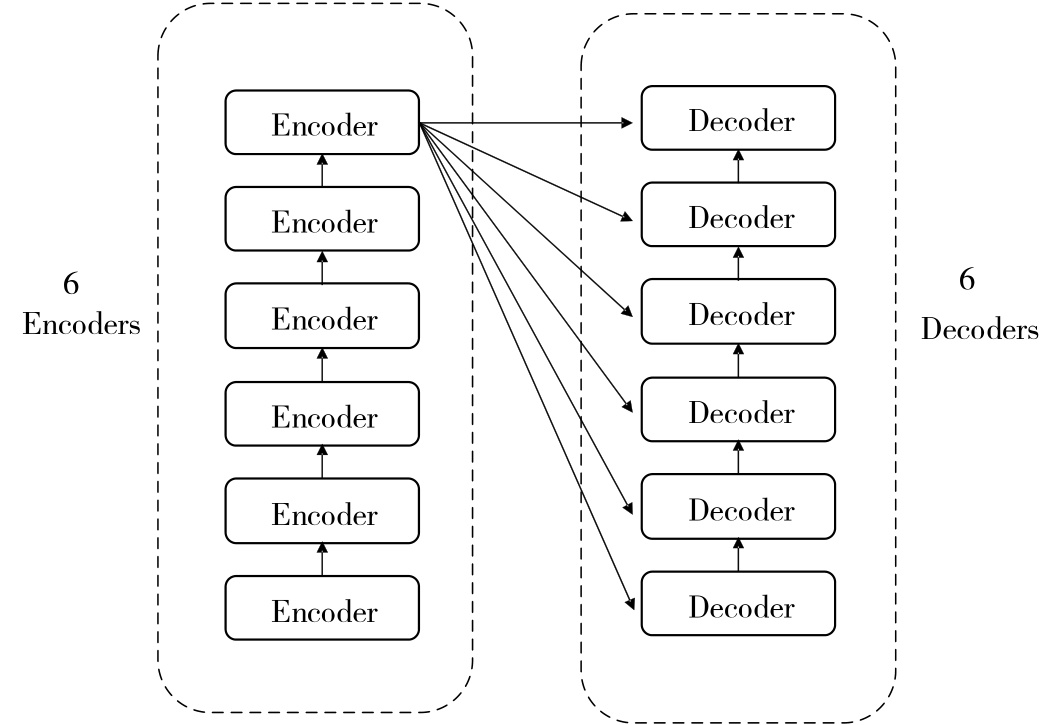 随着计算能力的提升, 更深入的模型架构(如Transformer类)[35]随之出现, 并伴随训练策略的进步, 使得预训练语言模型的发展呈现出明显的层次化趋势。传统的注意力机制模型往往结合卷积神经网络(CNN)和循环神经网络(RNN)进行联合设计, 而Transformer则完全基于自注意力机制(Self-Attention)进行建模, 与传统的基于顺序结构的模型不同, 它能够并行化训练过程, 并且能够捕获全局语义信息, 特别有效于解决序列数据中存在的长期依赖问题, 其具体架构可见图8。每个Transformer模块包含6个编码器层和6个解码器层, 这些编码器在结构上是相同的但并未共享任何参数, 每一层都可以分解为自注意力模块与前馈神经网络两部分组成; 解码器则在基础架构上增加了多头注意力子网络这一关键组件。关于这一方法论体系的相关细节, 可进一步参考文献[35]