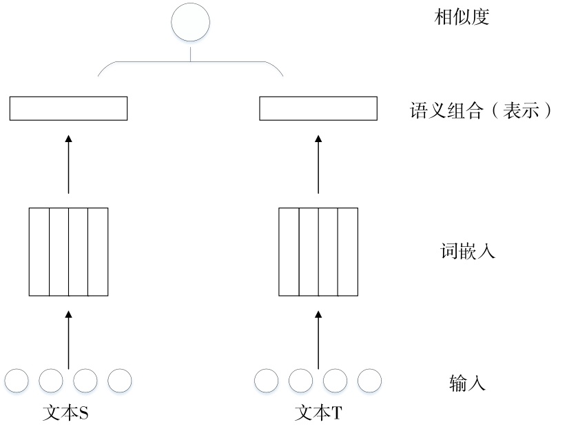 神经网络结构通过整合词与短语等基本语义单元构建更大的语义单元,并模拟其语法与语义信息。基于CNN、RNN等方法构建了常用的语义组合模型。本节从该分类出发系统阐述了经典的深度语义匹配模型。首先阐述了文本匹配任务的基本概念,并通过图1展示了文本匹配任务的基本框架示意图。