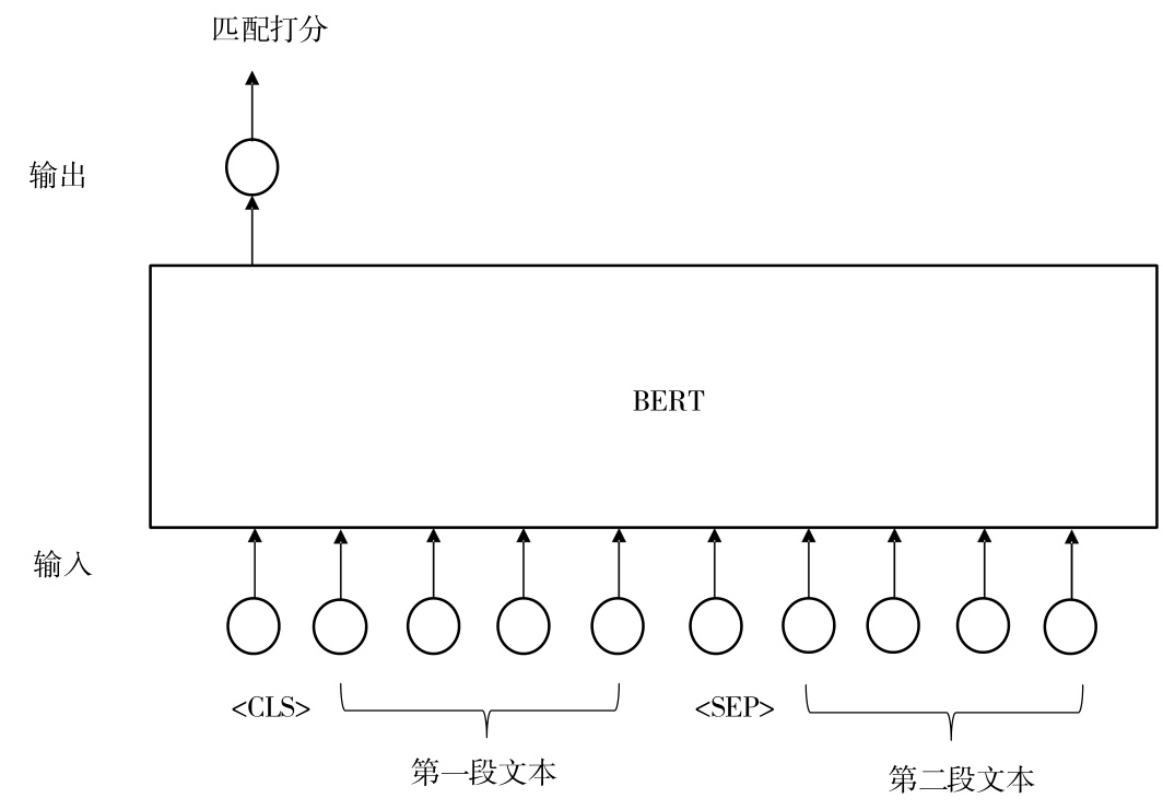 该预训练模型基于Transformer架构设计,并于发布时迅速获得了学术界的广泛关注。研究显示,在多个领域展现了卓越性能(例如GLUE基准测试[36]结果表明)。该模型采用双重预训练方法——掩码语言建模(Masked Language Model, MLM)与下一句预测(Next Sentence Prediction, NSP),分别学习词性和句法层次的信息。经过预先训练后,在该模型基础上进行微调优化可以显著提升下游任务的表现能力。值得注意的是尽管采用了MLM方法进行预训练但其独特的双向交互机制使其不适合生成文本任务而更适合理解型任务具体而言用于匹配任务的微调结构如图9所示展示了其在特定应用场景中的实际应用效果。