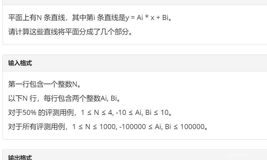 2.如果新增的直线与平面内所有的直线有交点,且这个交点和之前的交点不一样(交点用set去重)那么增加的分割数就是交点数+1。