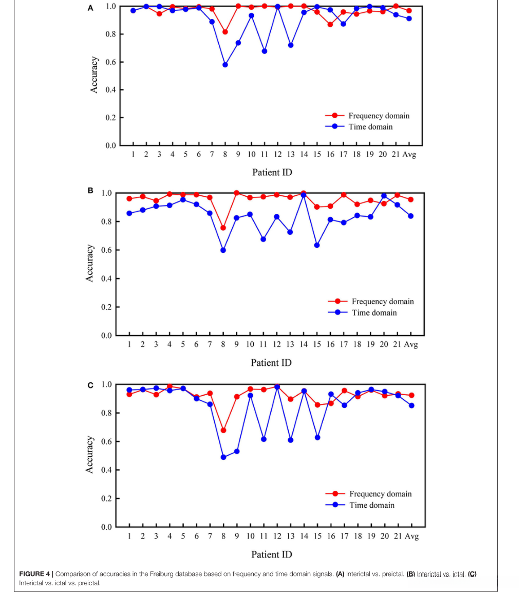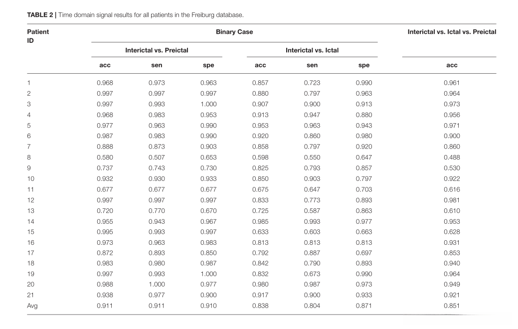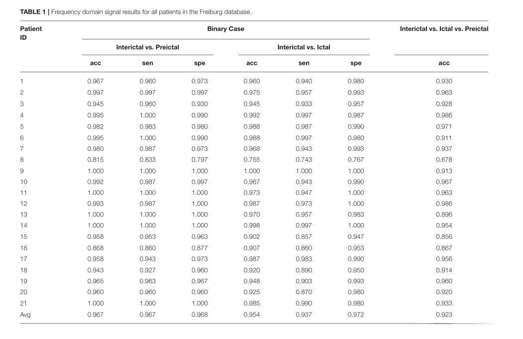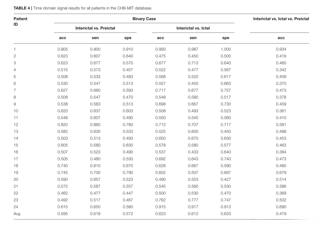 采用了基于时间和频域信号的Freiburg和CHB-MIT数据库对这里描述的方法进行了系统性评估分析。该系统经过多组实验验证,在三个不同案例上进行了研究:针对两类不同的二分类问题,在两个特定的时间段内进行研究[(I)发作间期与发作前 和(Ii)发作间期与发作];此外还研究了一个三类问题(发作间期与发作期与发作前)。为确保客观性我们为每个患者单独训练并独立测试了我们的方法;所有被分析的数据结果已详细列举于表1至表4中,并重点指出了模型所获得的关键性能指标包括准确率、敏感性和特异性