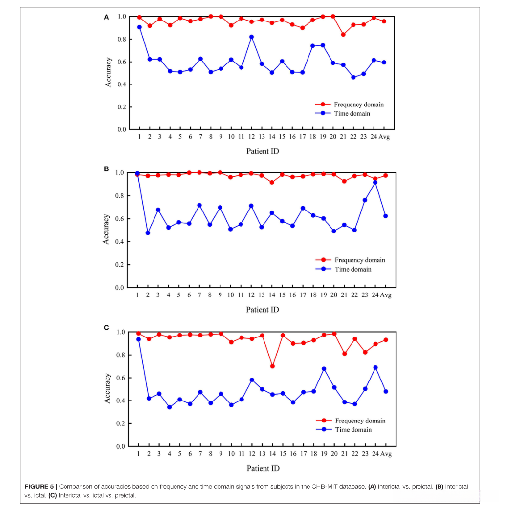 图5对CHB-MIT数据库中的受试者基于频率特性和时域信号的分类性能进行了详细对比分析。通常而言,在频域中可以有效识别这三种临床表现特征。与基于时域的方法相比,在频域上实现的分类方法具有显著优势(P值小于0.05)。具体而言,在三次实验中使用频域信号计算所得的平均分类正确率分别为95.6%、97.5%和93.0%,显著高于采用时域信号计算所得的结果(分别为59.5%、62.3%和47.9%)。在所有患者群体中使用频域信号所获得的分类性能均优于采用时域信号的情况