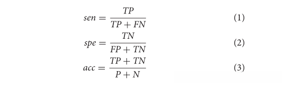 用于评估分类效果的关键指标包括准确率(Acc)、召回率(Sen)和精确率(Spe) ,具体计算方式如下: