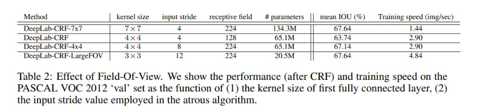 - 速度:空洞卷积的算法,使得速度提高很多,DCNN操作8 fps,CRF处理一张0.5s