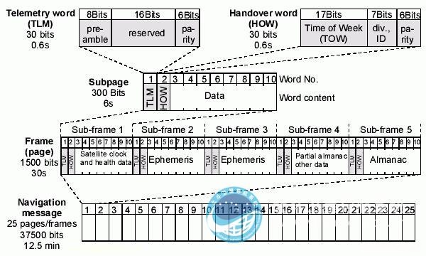 导航电文用于计算卫星当前的位置和信号传输的时间,从而使GPS接收机在接收导航电文后能确定自身的位置。每个卫星独自将数据流调制成高频信号,数据传输时按逻辑分成不同的帧,每一帧有1500位,传输时间需30秒。每一帧可分为五个子帧,每子帧有300位,传输时间为6秒。每25帧构成一个主帧,传输一个完整的历书需要1个主帧,也就是需要12.5分钟。一个GPS接收机要实现其功能至少要接收一个完整的历书。