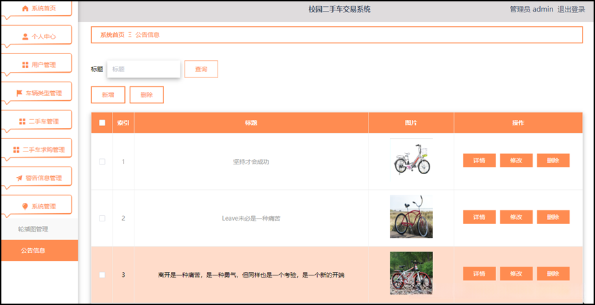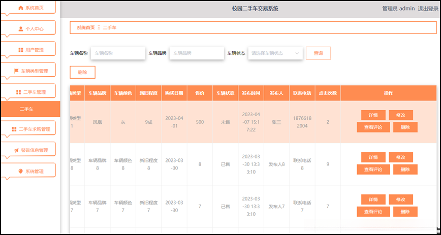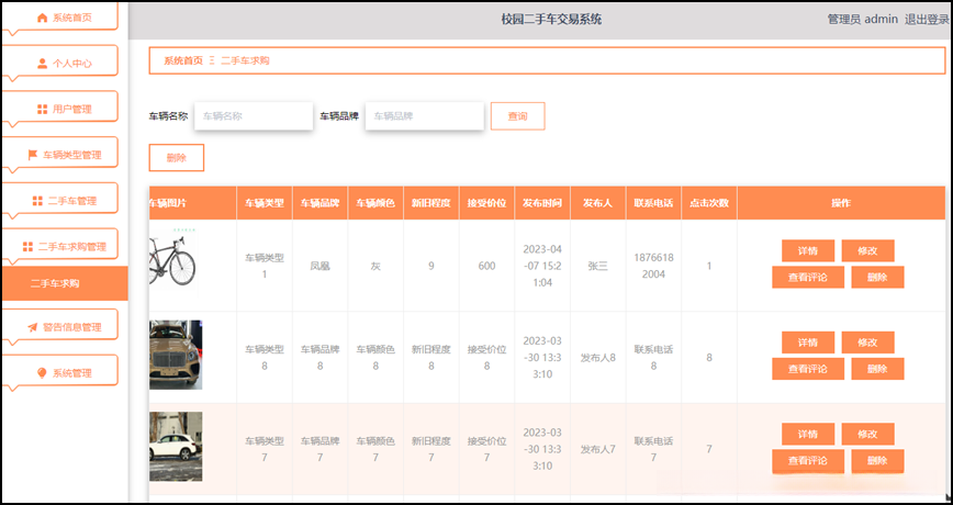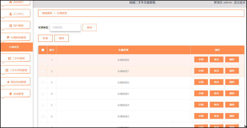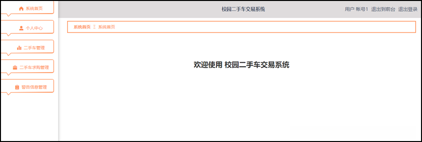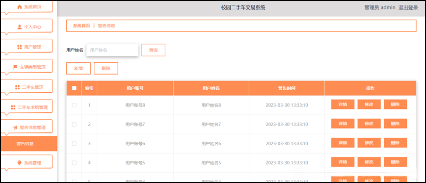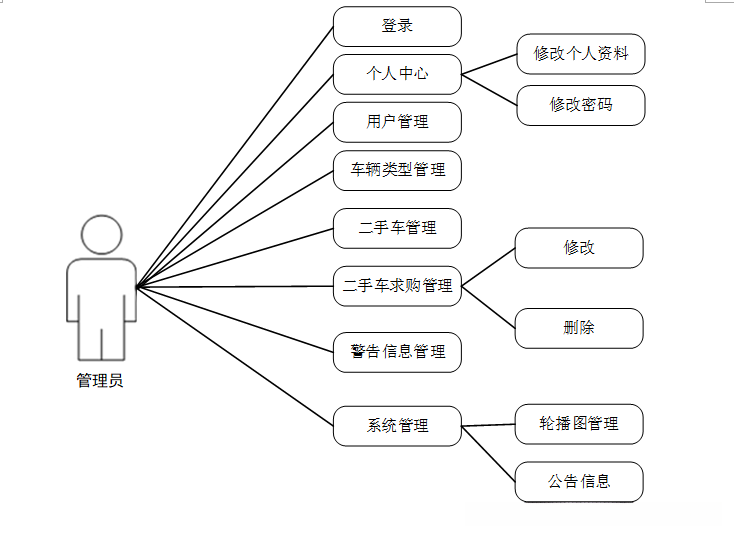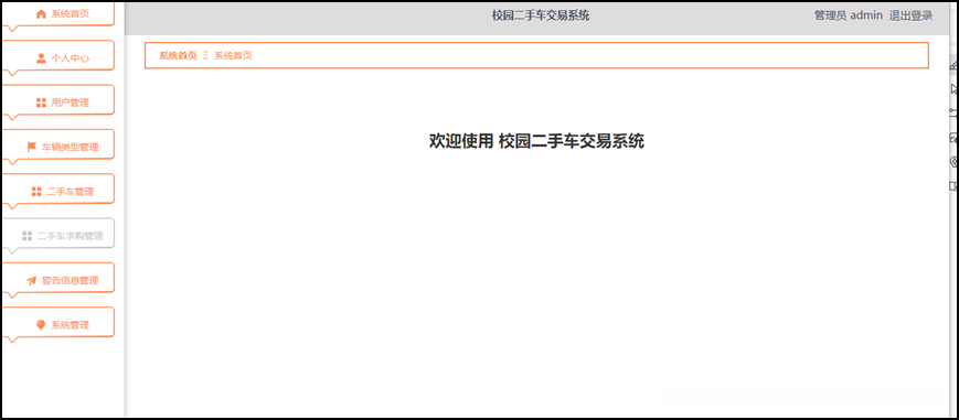 在校园二手车交易系统中, 管理员的主要职责包括个人中心, 用户管理, 车辆类型管理, 二手车管理, 二手车求购管理和警告信息管理系统等功能需求。该系统旨在审查相关数据是否违反规定,并对违规账号, 车辆以及二手车求购进行相应的处理行为, 最终赋予其增删改查的权限。