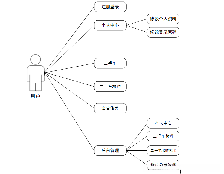 校园二手车交易系统支撑前台用户的二手交易平台以及个性化服务需求,并包含二手求购和公告发布等功能模块。管理员负责管理所有用户信息和车辆数据,并具备统一调控这些资源的能力。这些功能均依赖于与后端服务器的数据交互完成。具体的系统功能结构图如图4-2所示