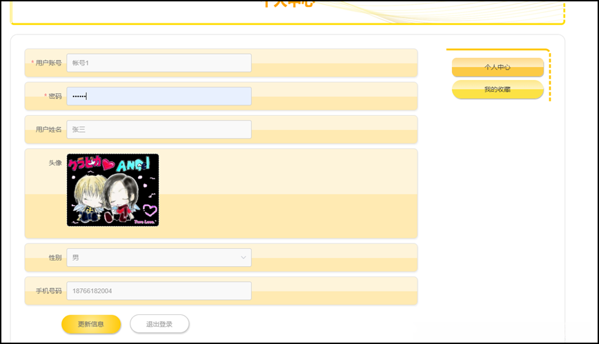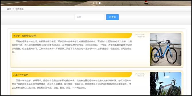 见图5-6公告信息页面,在个人中心界面中可对个人信息进行更新操作,并根据需求完成收藏内容的具体调整;其中涉及的管理功能部分如图5-7所示;