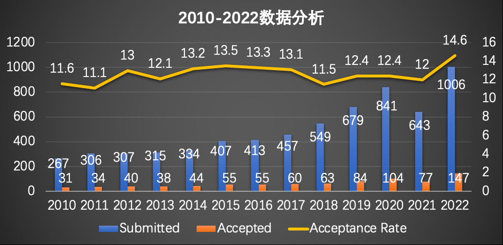 S&P的录取率较低,基本是11%-15%之间浮动,而S&P'22的录用率为14.6%,创历史最高纪录!S&P的投稿量呈现出整体上升的趋势,去年的投稿量更是达到了1006篇,首次超过1000篇,S&P的录用量也随着投稿量的增加而增加,S&P'22达到147篇。S&P’23年的录用情况暂时还未查询到!据论文录用者透露,论文接收时并没有通知录用率,估计要开会时才知道。