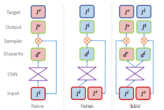 本文在现有方法的基础上进行了创新,在训练中用更容易获得的双目立体图像代替显式深度图的使用。利用极几何约束,用图像重建损失训练网络生成视差图像。只用图像重建损失得到的深度图质量差,作者一共利用了三个损失函数。