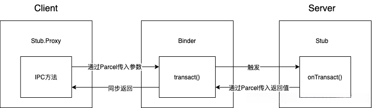 - 建立一个包含参数和返回值的Parcel对象容器,并将参数存储于其中。
