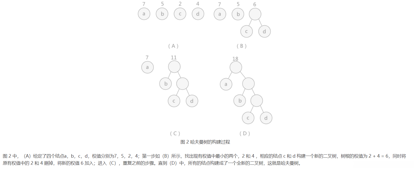 (2) 在该集合中选择具有最小权值之和的两棵不同的树进行合并;