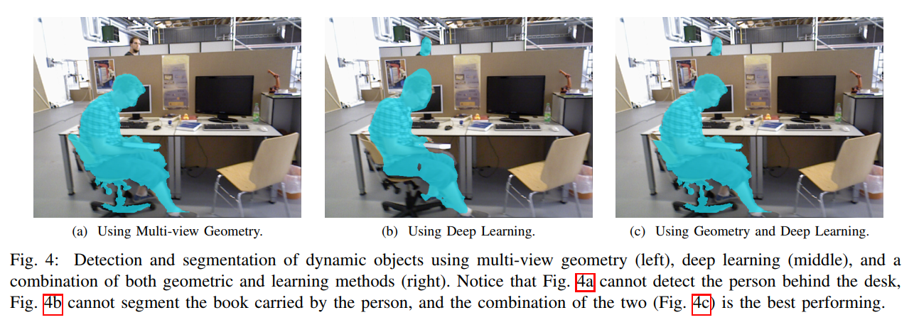 卷积神经网络(CNN)的输出(图4b)可以通过与几何方法的结果相结合来实现完整的动态物体检测(图4c)。通过对比分析它们的优缺点后发现将两者综合运用效果更好。对于几何方法而言主要问题在于由于其多视角性质导致初始化较为困难。深度学习方法在单视角上表现出色并避免了初始化的问题然而它们的主要缺点在于认为单个视角下的物体被视为静态在这种情况下可能会移动而该方法无法识别出来。可以通过多视角的一致性测试来解决这一问题。