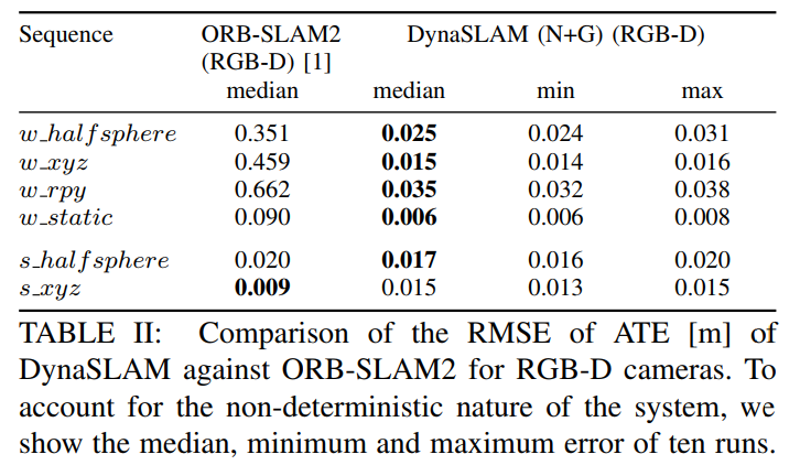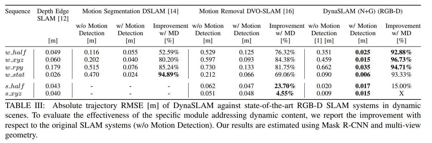 表III展示了我们系统的性能与专为动态环境设计的多款RGB-D SLAM系统的对比结果。为了评估我们提出的方法及其在运动检测领域的最新进展(无论使用的SLAM系统如何)的表现效果,我们不仅进行了直接对比实验,并且还在每种测试条件下都计算并展示了改进幅度。此外,在每款用于比较的原始SLAM系统的基础上进行了相对性分析,并观察到了显著提升的趋势。其中DynaSLAM在所有测试序列(无论是高动态还是低动态序列)中均表现出明显的优势。其定位精度通常维持在1至2厘米之间,并且这与静态场景中最先进的技术表现相当。