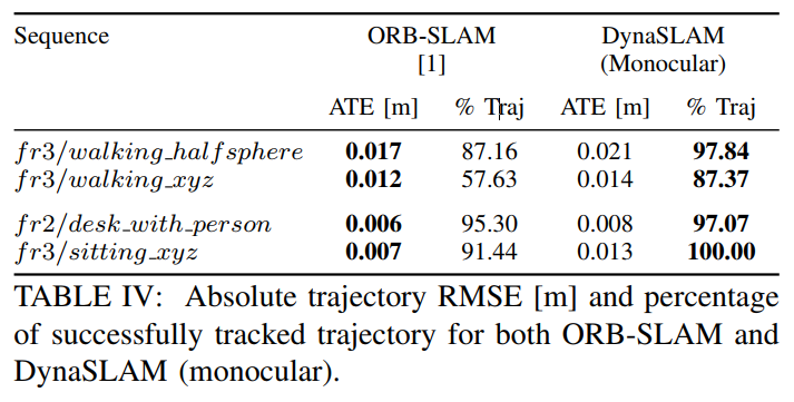 表IV展示了ORB-SLAM与单目DynaSLAM在TUM数据集中的跟踪效果及其轨迹百分比分布。从实验结果来看,在动态场景中DynaSLAM的初始化速度始终优于ORB-SLAM。实际上,在动态物体离开场景时才会触发ORB-SLAM的初始化过程。综上所述尽管DynaSLAM在精度上稍逊于ORB-SLAM但它成功地通过启动系统利用动态环境并生成不含动态内容的地图从而为长期应用提供了便利(参见图1和图2)。进一步分析表明OR-B SL AM由于其轨迹估计更为冗长导致空间累积误差的存在