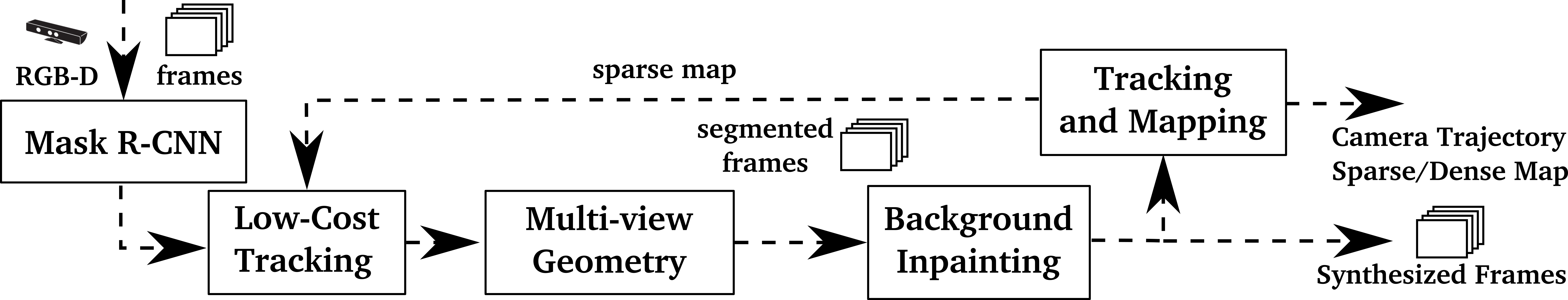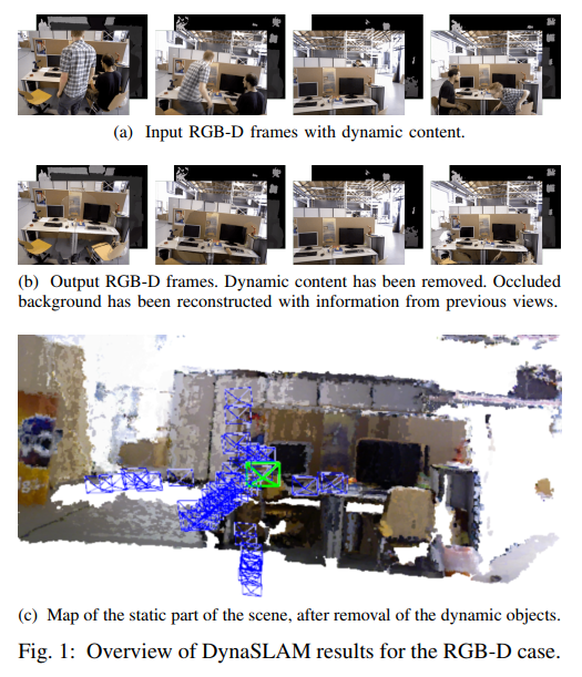 **论文工作 :**我们开发了一种实时算法旨在处理RGB-D、立体视觉以及单目SLAM系统中的动态物体。在现有ORB-SLAM2框架的基础上增加了前端模块,并实现了更高的追踪精度以及可复用的场景地图生成能力。针对单目相机及立体视觉系统的情况建议采用卷积神经网络对每帧图像中的预定义动态物体(如人与车辆)进行像素级别的分割。从而避免SLAM算法在此处提取特征信息。针对带有RGB-D信息的情况建议采用多视图几何模型与深度学习结合的方法检测动态物体。通过去除这些物体后,在剩余图像中恢复背景结构并引用相关数据完成遮挡区域的信息重构(见图1)。
